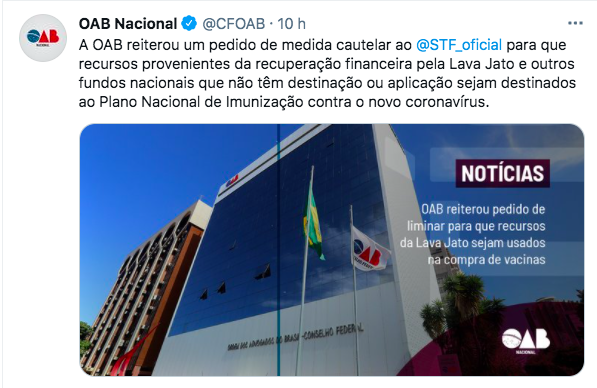 O Conselho Federal da OAB (Ordem dos Advogados do Brasil) voltou a pedir nesta segunda-feira (1) ao Supremo Tribunal Federal (STF) para que os recursos recuperados pela Operação Lava Jato sejam usados no plano de vacinação nacional contra a Covid-19.