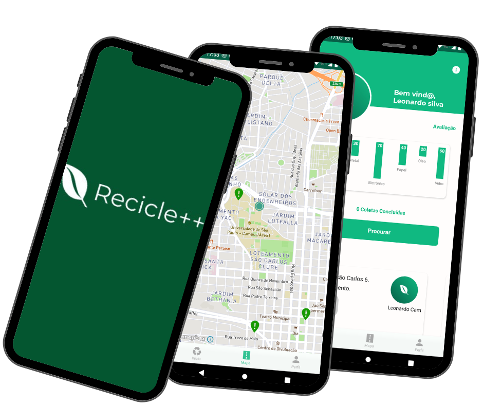 A plataforma Recicle++ dispõe de três aplicativos: um para doadores, outro para coletores e um terceiro destinado a ONGs e prefeituras responsáveis pelo gerenciamento de resíduos