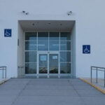 Edifício da CLDF em Brasília com símbolos de combate à violência contra a mulher e viatura policial, destacando falhas na reintegração de policiais.